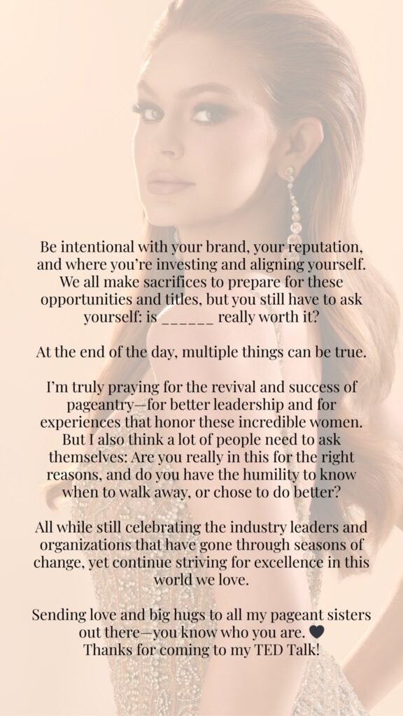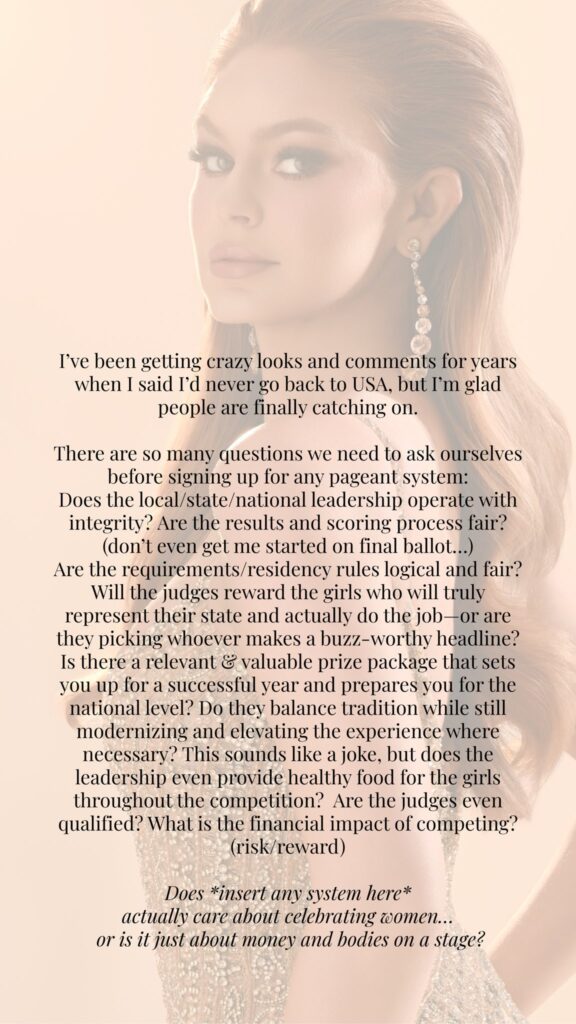 I’ve prayed and reflected on this for months, but given all of the craziness that has happened in pageant land over the summer, I figured it was the right time to share.